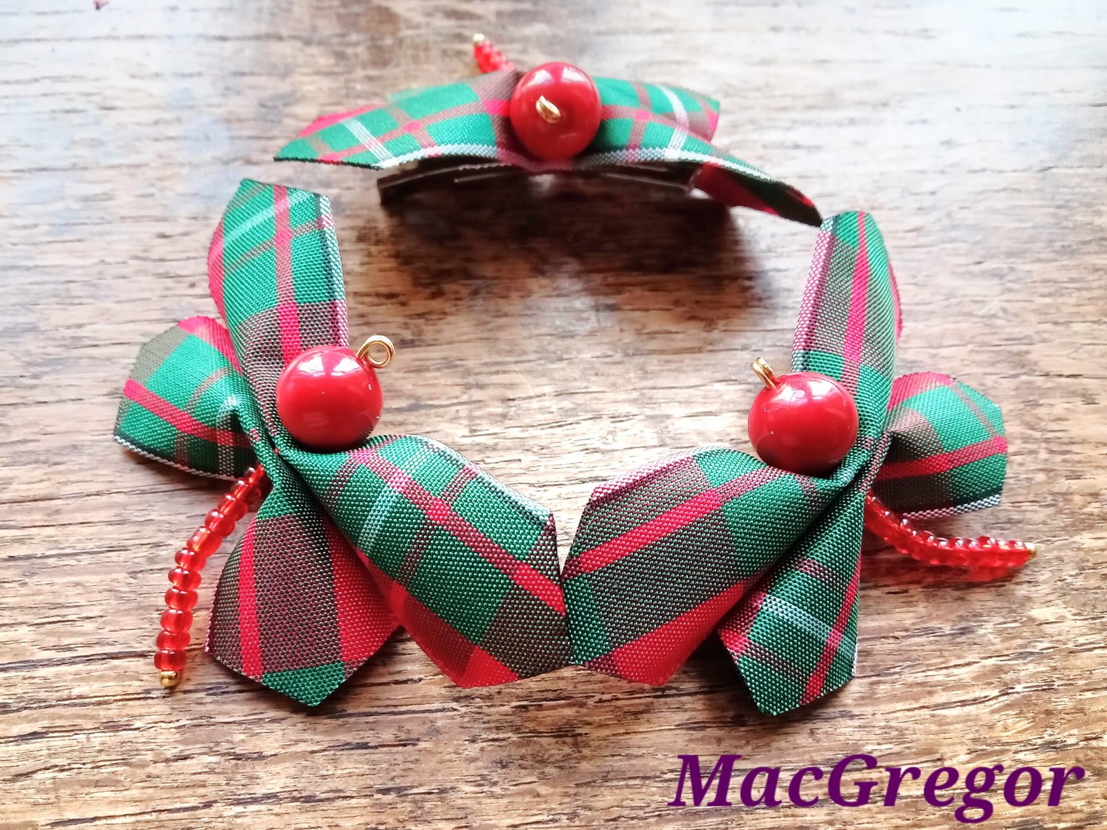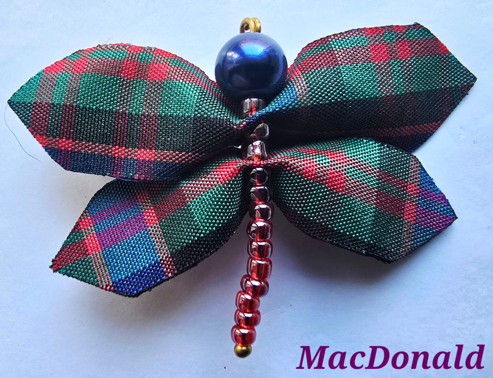 The dragonfly is approximately 1 and 1/4″ high and 2″ wide. Bead (body) colour will vary to match your preferred tartan. If you want a particular bead colour, please contact us and let us know.